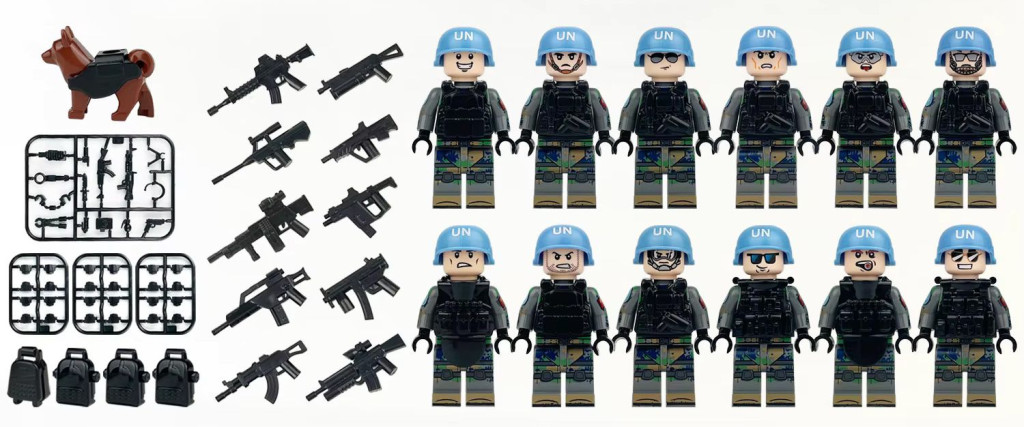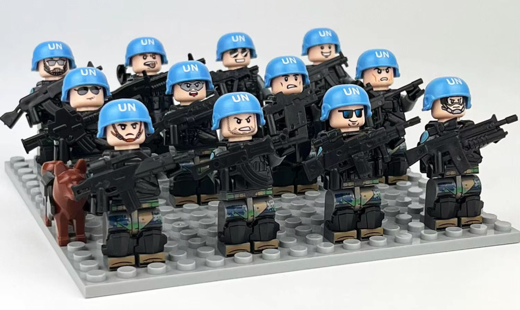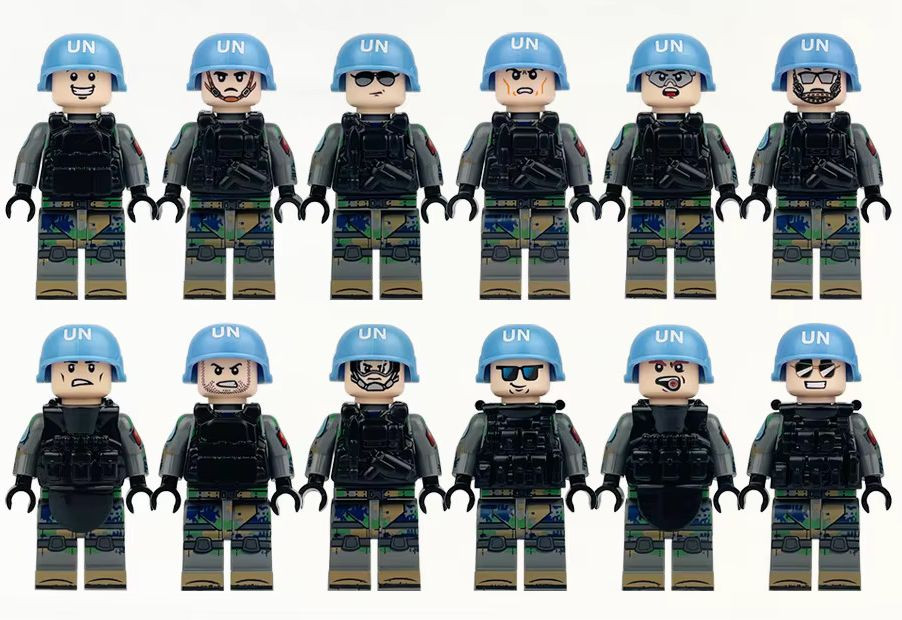 12 darab ENSZ békefenntartó építőjáték figura, számos kiegészítővel, alaplappal