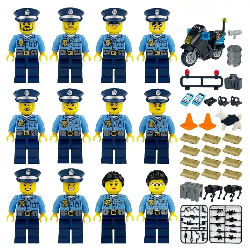 Rendőrség építőjáték figura szett - 12 db rendőrfigura számos kiegészítővel, 1 db motorkerékpárral