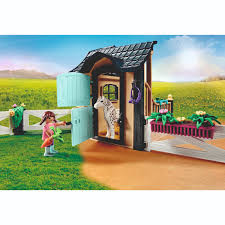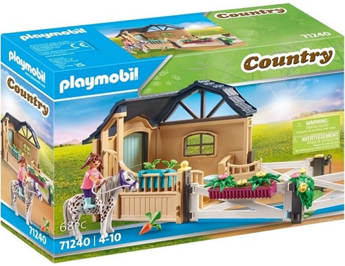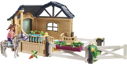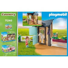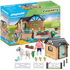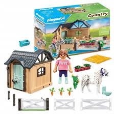 68 darabos Playmobil Country - Istálló karámmal szett. Az építőjáték tartalmaz 1 db kislány és 1db lovacska figurát, valamint egy összeépíthető istállót karámmal, továbbá virágosládát virágokkal, a lovacskának 3 db répát, 1 db etetőt, 1 db itatót, 1 db kötőféket és gyeplőt.