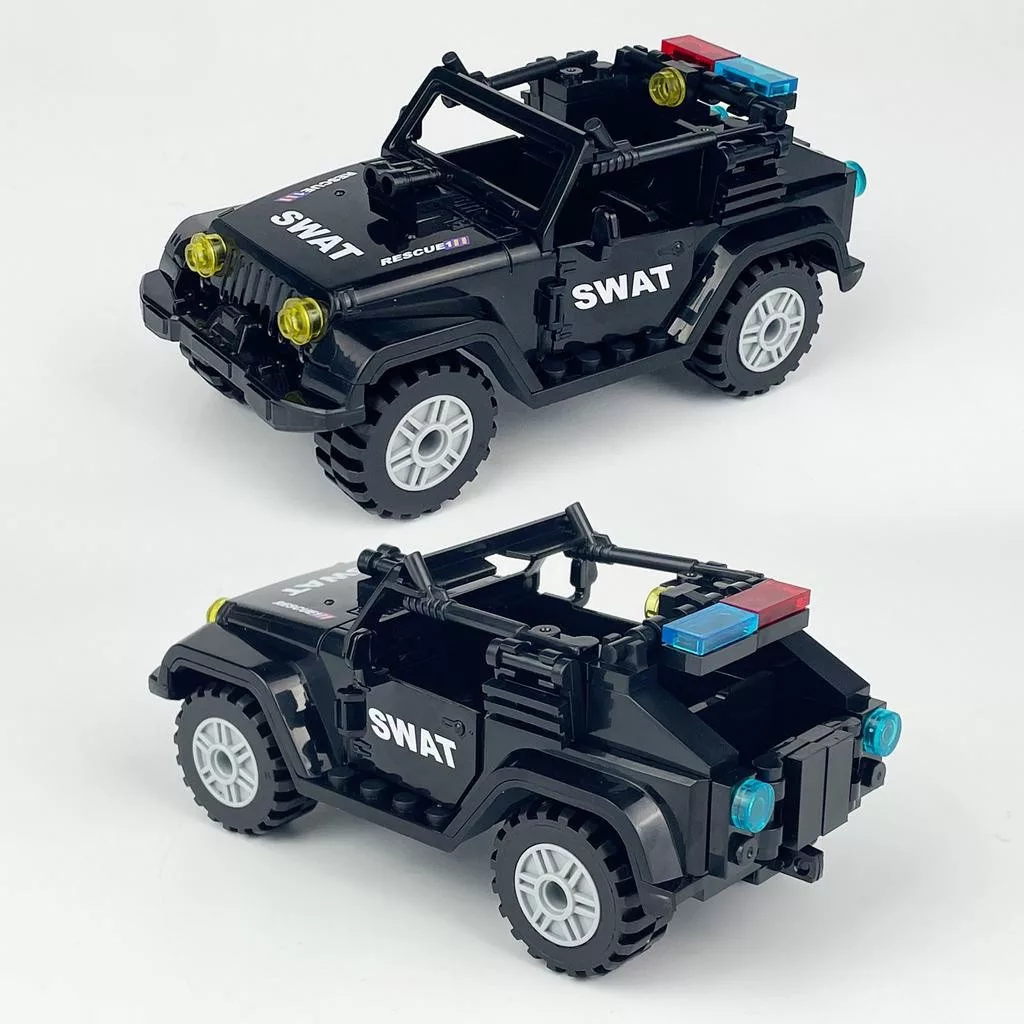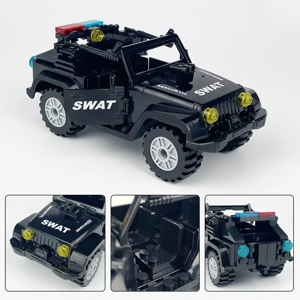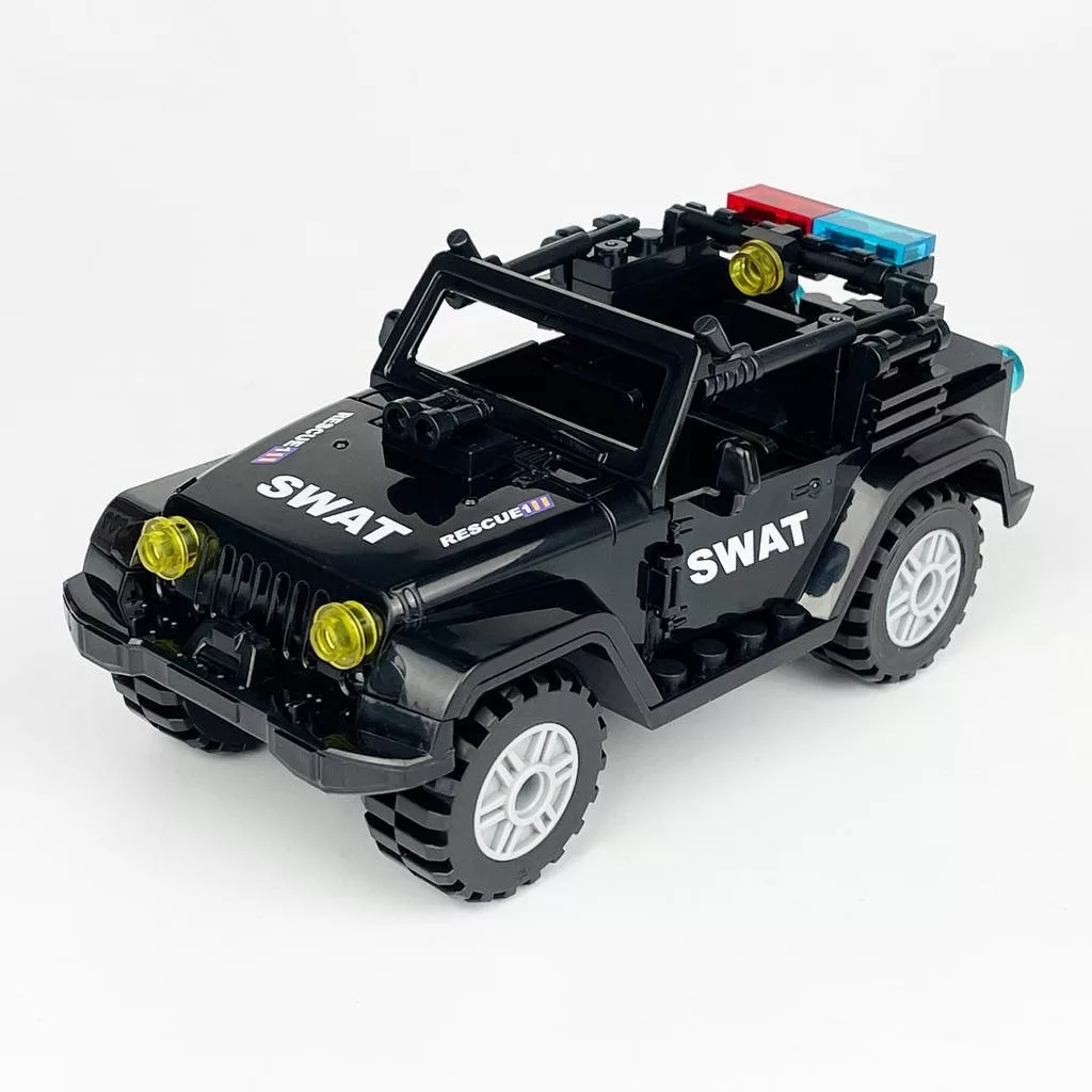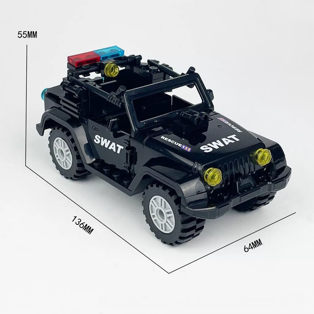 SWAT építőjáték készlet 12 db rendőrfigurával, 2 db kutyafigurával, 1 db SWAT dzsippel és számos kiegészítővel